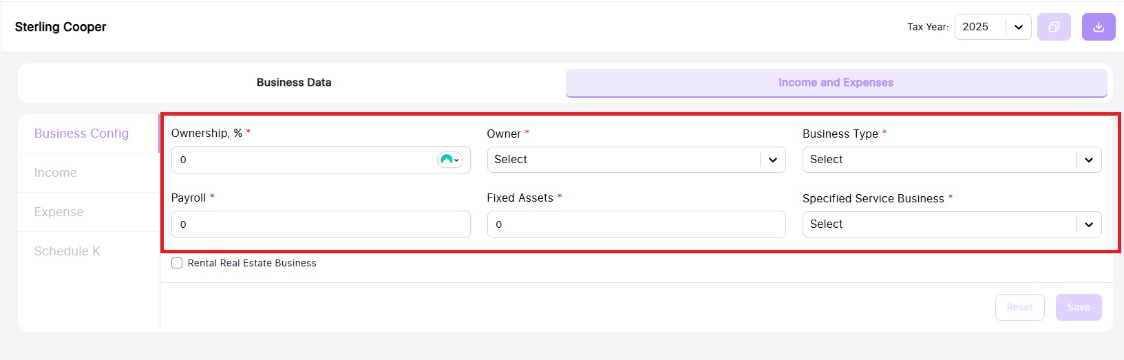Important! You must complete the Ownership %, Owner Name, Business Type and Specified Service Business option for the QBO sync to work correctly
