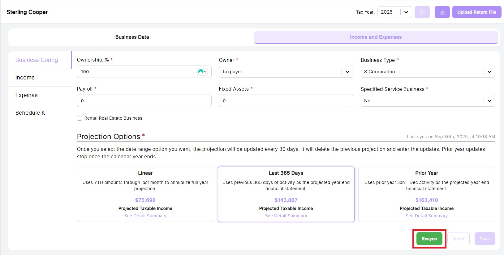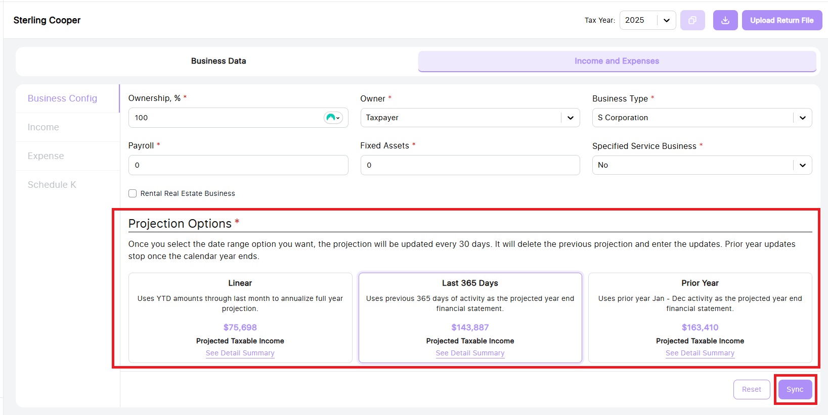 Next, navigate to the Income and Expense tab. You will see 3 Projection Options. Click on the desired option and then click Sync