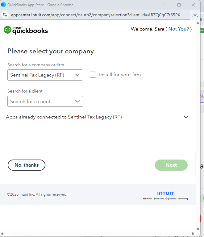 Select your company or firm and then select the client account you wish to connect. Click Next.