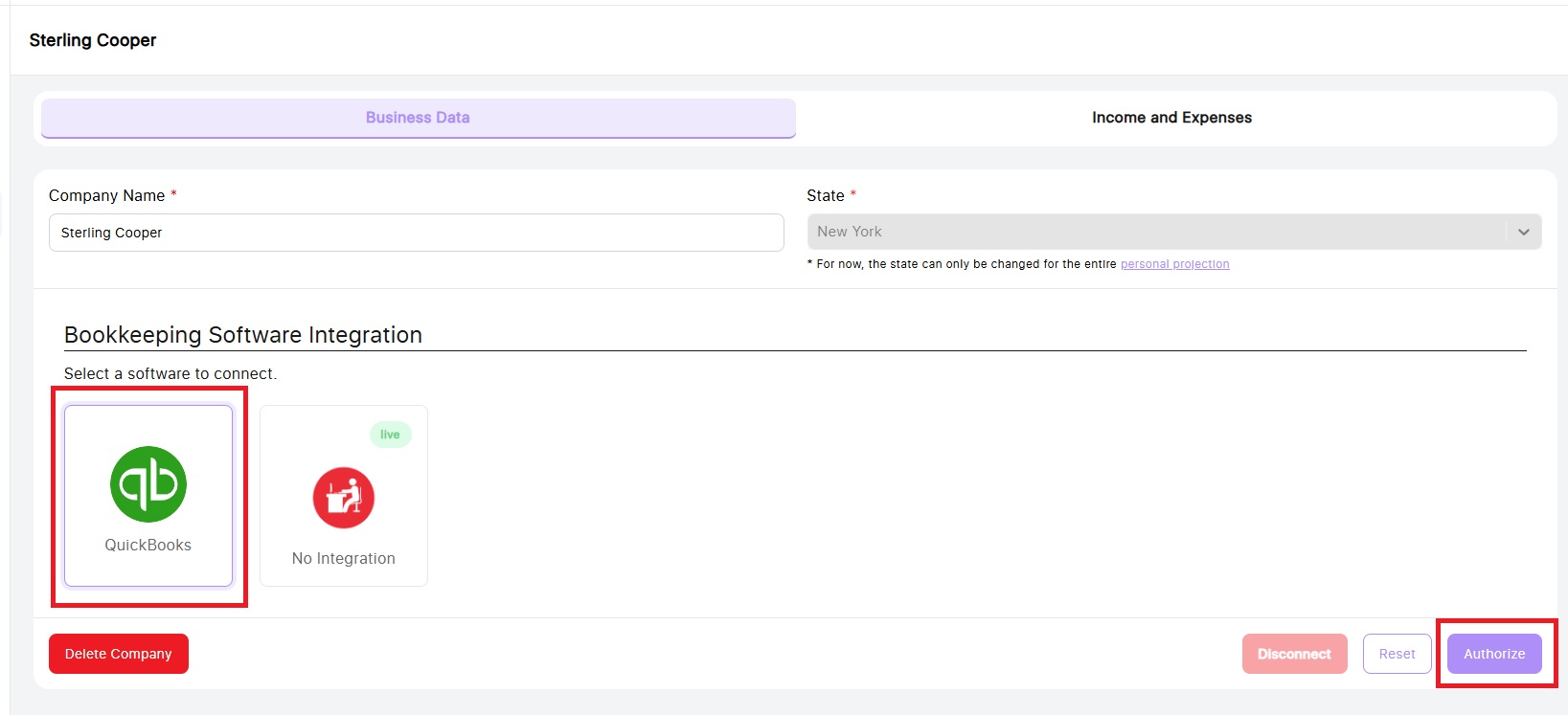 On the Business Data tab, you will see an option to connect QuickBooks. Click on the QBO icon and then click the purple Authorize button